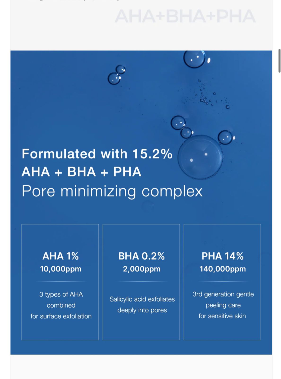 Visible results in just one day. Overnight resurfacing serum, formulated with 15.2% AHA + BHA + PHA- (Pore minimizing complex with all-in-one pore care solution (High efficacy, low irritation) AHA 1% – 3 types of AHA combined for surface exfoliation BHA 0.2% – Salicylic acid exfoliates deeply into pores PHA 14% – A new generation of AHA, gentle peeling for sensitive skin. This serum not only minimizes pores but also provides additional benefits such as toned up skin, reducing blackheads, whiteheads, and excess sebum production. It is clinically proven to refine pores and improve skin texture.